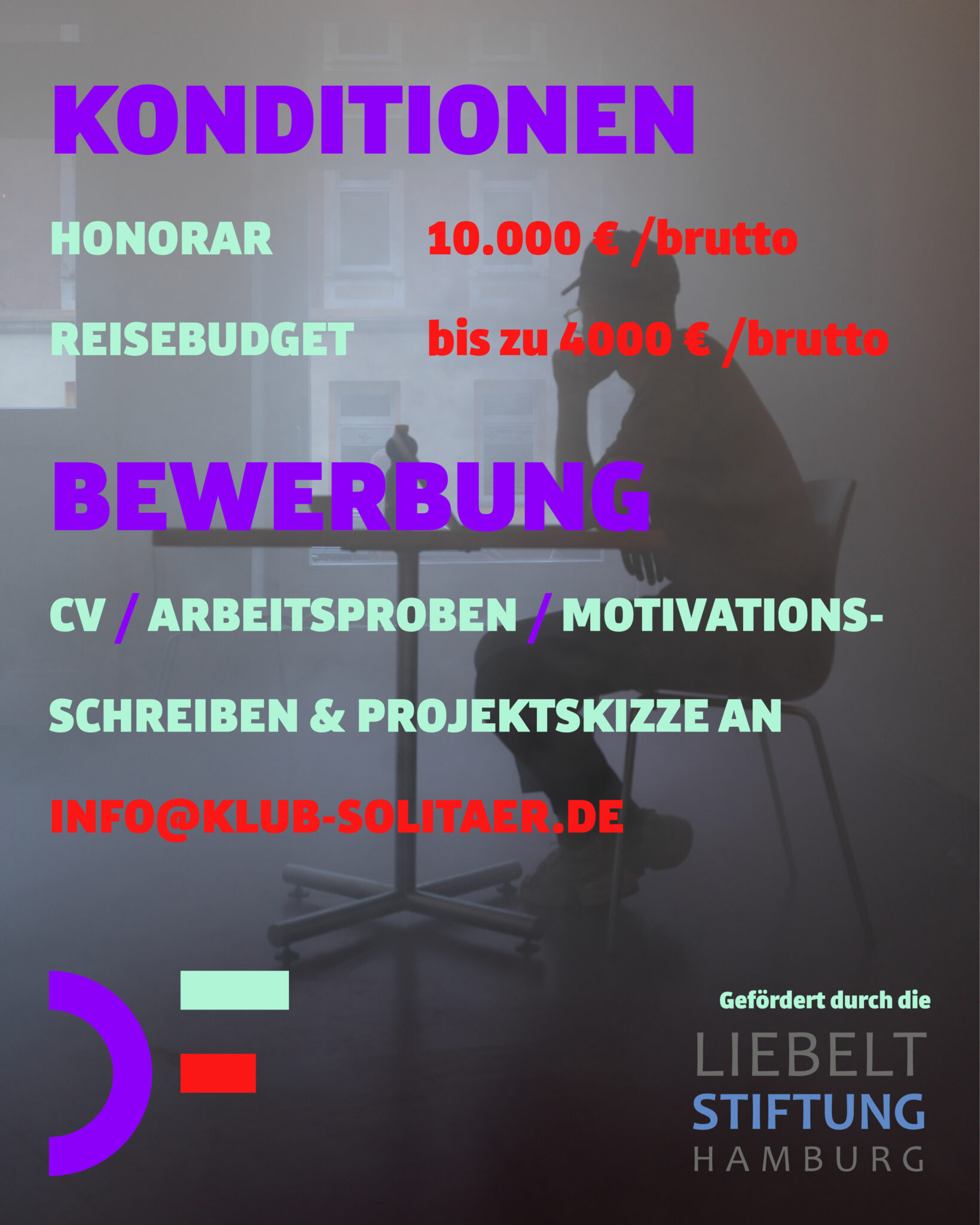 Mit Unterstützung der Liebelt-Stiftung, Hamburg schreibt der Klub Solitaer e.V. eine kuratorische Residenz inklusive Recherche- und Reisebudget aus. Dabei bereitet die kuratorisches Residenz wiederum, das künstlerische Residenzprogramm Dialogfelder im Folgejahr vor. Wir verstehen Kurator:innen hierbei als aktive Gestalter:innen: forschend, vermittelnd und organisierend. Der Fokus liegt auf der überregionalen Vernetzung von Kunsträumen in Ost und West, um gemeinsam Strategien im Umgang mit Transformation zu erproben. Nachwuchskurator:innen erhalten die Chance, ihre Praxis im realen Stadtkontext anzuwenden, Kooperationen zu fördern und Konzepte für ortsspezifische Werke zu entwickeln, die in die Stadtgesellschaft hineinwirken.